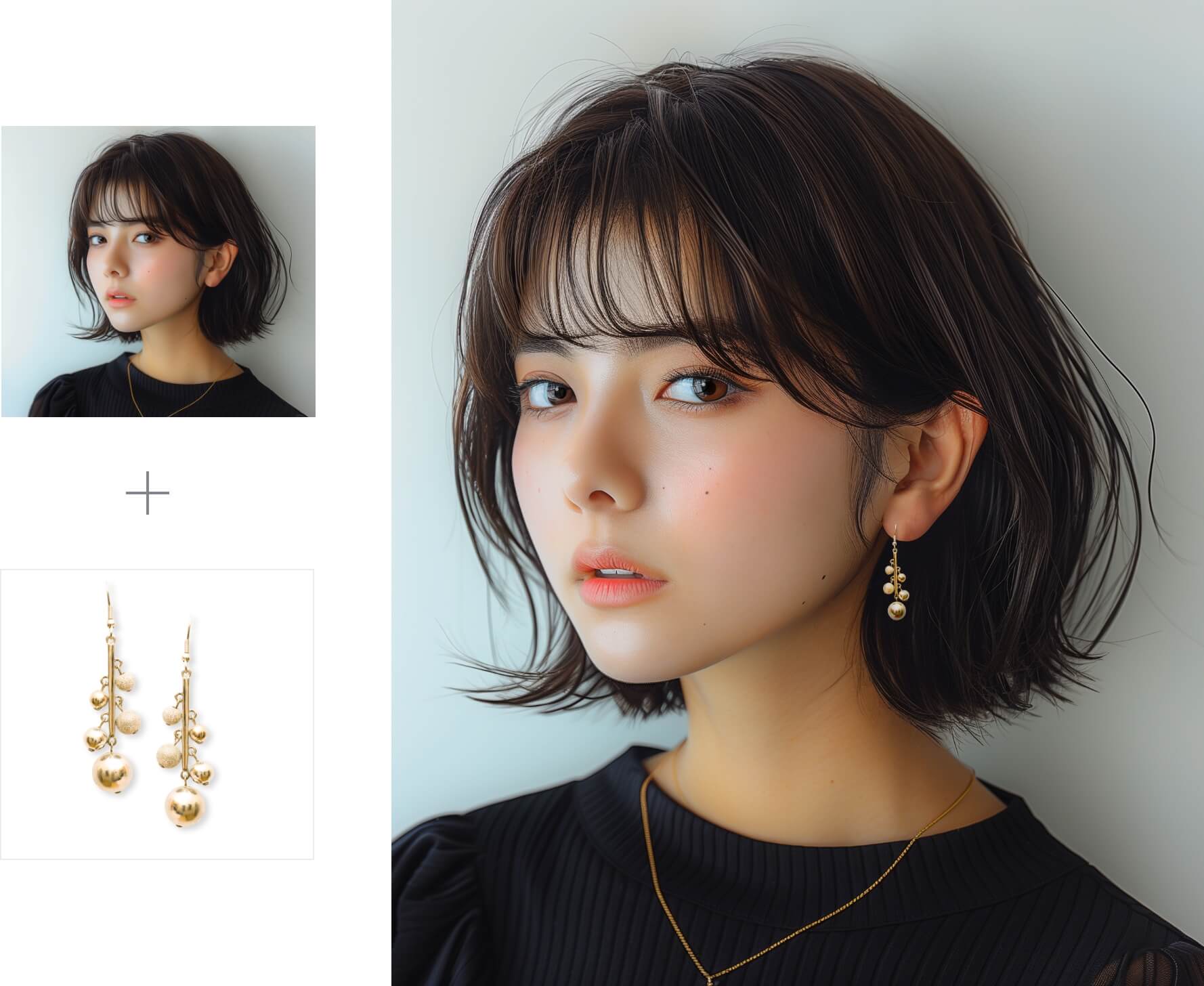 ブランドのイメージやコンセプトにあったAIモデルを生成できるため、アクセサリー/ジュエリーなどの商品を撮影するだけで、モデル着用画像が完成。商品の点数分モデル撮影を行う必要がないため、モデルのキャスティングコストや撮影コストを大幅に削減できます。
