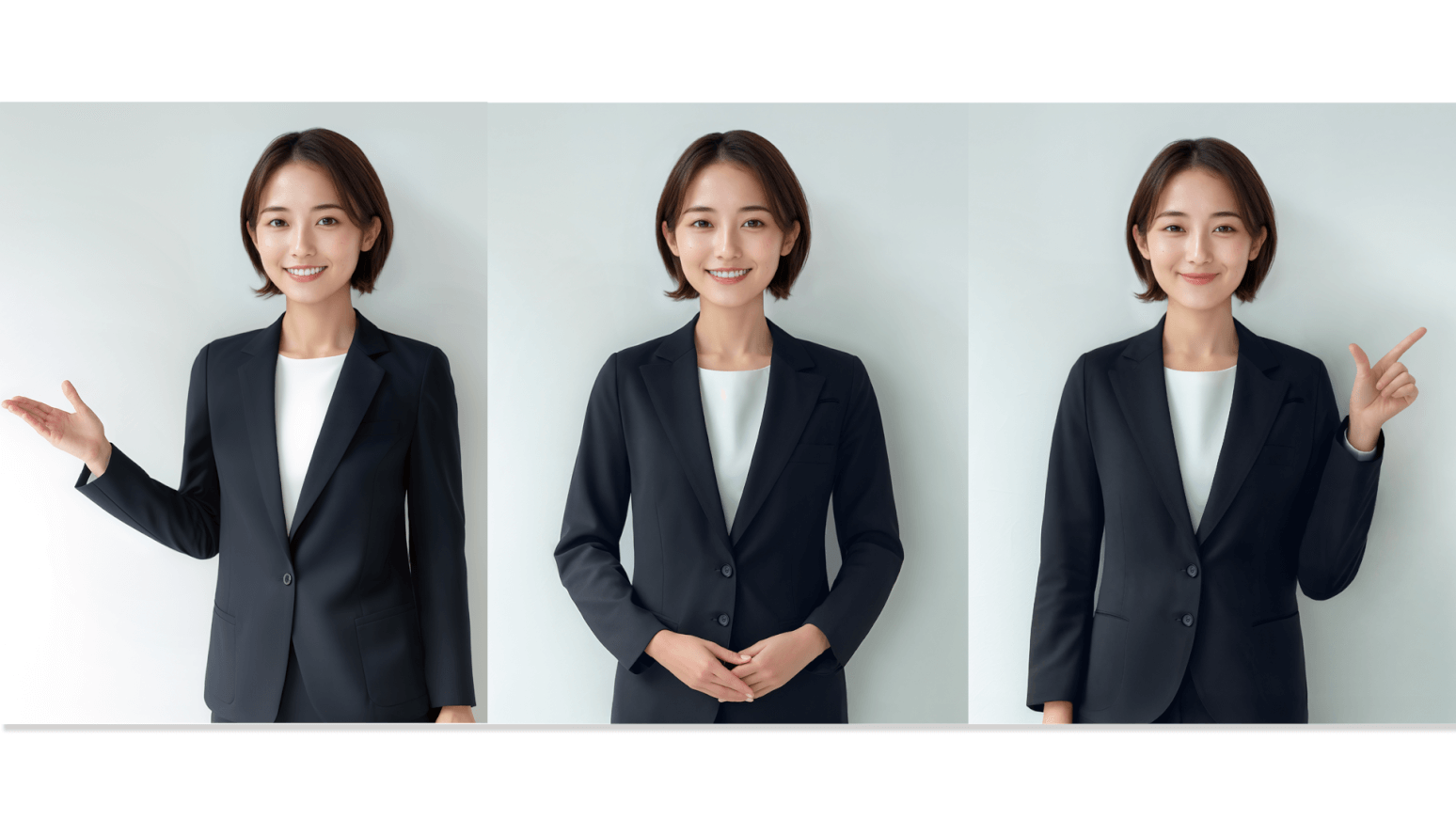 お顔のこだわりだけでなく、身体部分も自然になるように気を配りながら制作いたしました。企業ロゴをイメ―ジしたオリジナルポーズ(左手でロゴマークを表現するポーズ)も、AIにて再現いたしました。